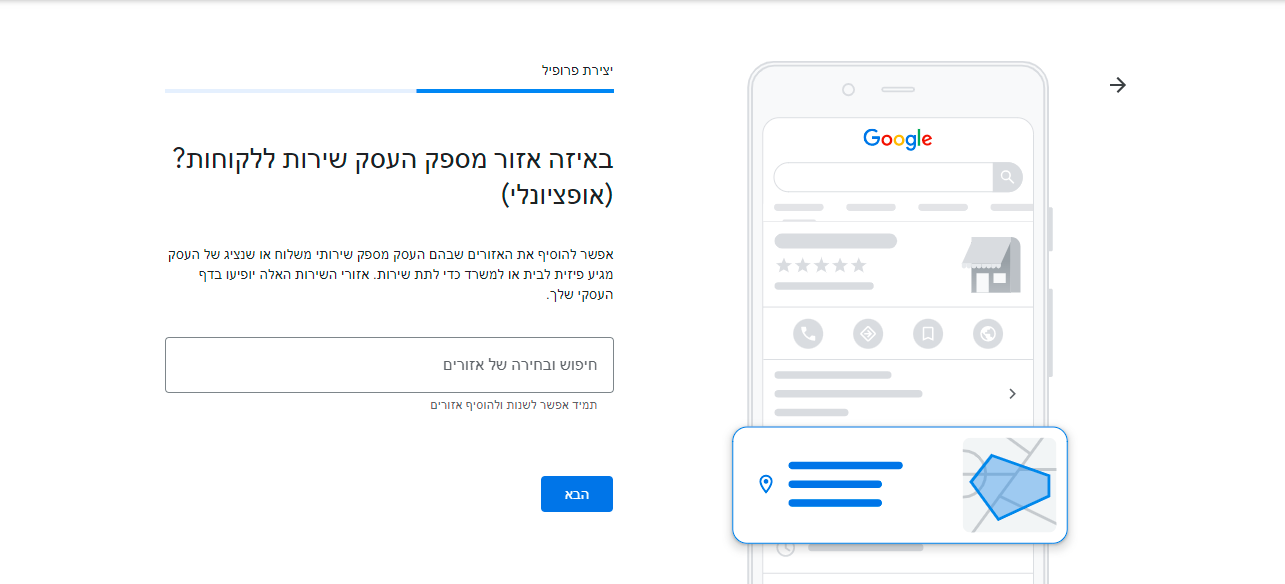 במסכים הבאים ניצור פרופיל עסק: נבחר קטגוריה, אזורי שירות ועוד.